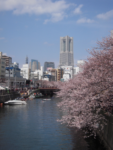 大岡川のこの橋の上からはランドマークタワーと桜のコラボが